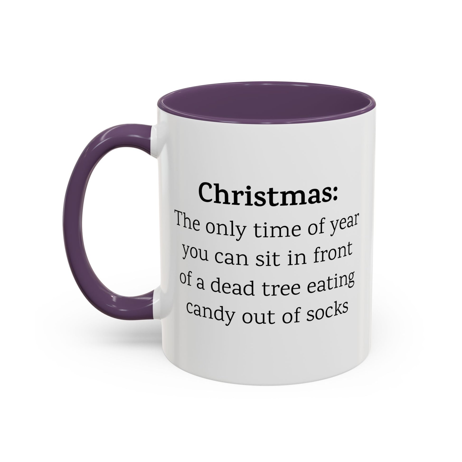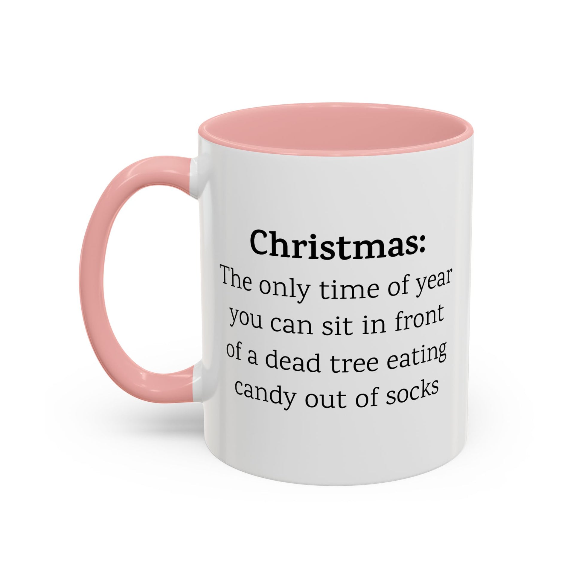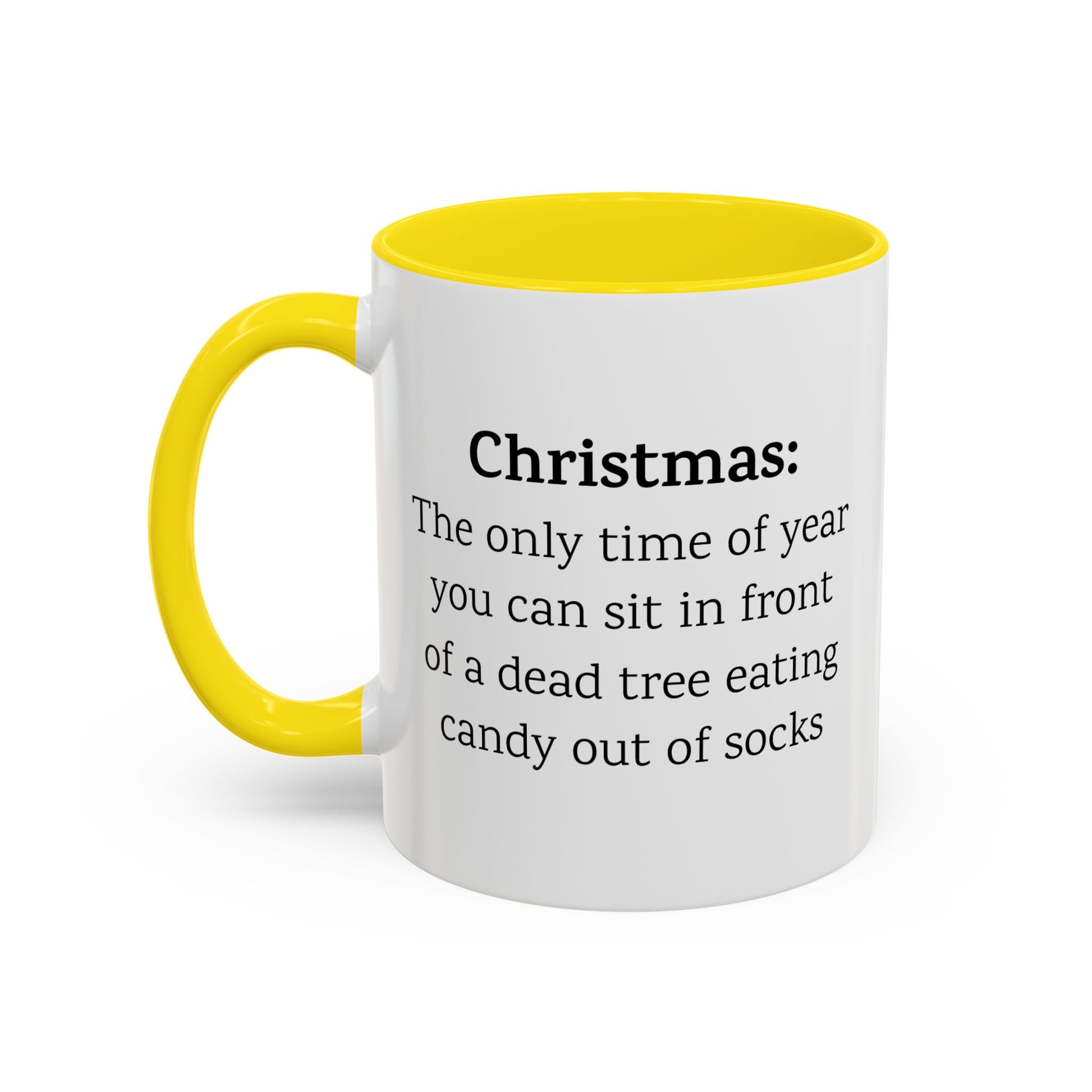 "Kersfees: Die enigste tyd van die jaar wat jy voor 'n dooie boom kan sit en lekkers uit sokkies eet". Perfek om 'n tikkie humor by jou vakansiedae te voeg! Ontmoet jou volgende gunsteling oggendmaat, die keramiekbeker met aksent. Hierdie beker bring die perfekte mengsel van styl en funksionaliteit om jou koffie-, tee- of warm sjokolade-ritueel te verhef. Beskikbaar in 'n 11oz-grootte (0.33 l). Gemaak met wit keramiek in 'n slanke glansafwerking met opvallende kontras, is hierdie beker 'n plesier om uit te drink en na te kyk. Die ergonomiese C-vormige handvatsel bied 'n gemaklike greep, terwyl die loodvrye en BPA-vrye konstruksie gemoedsrus met elke slukkie bied. Gratis wêreldwye versending.