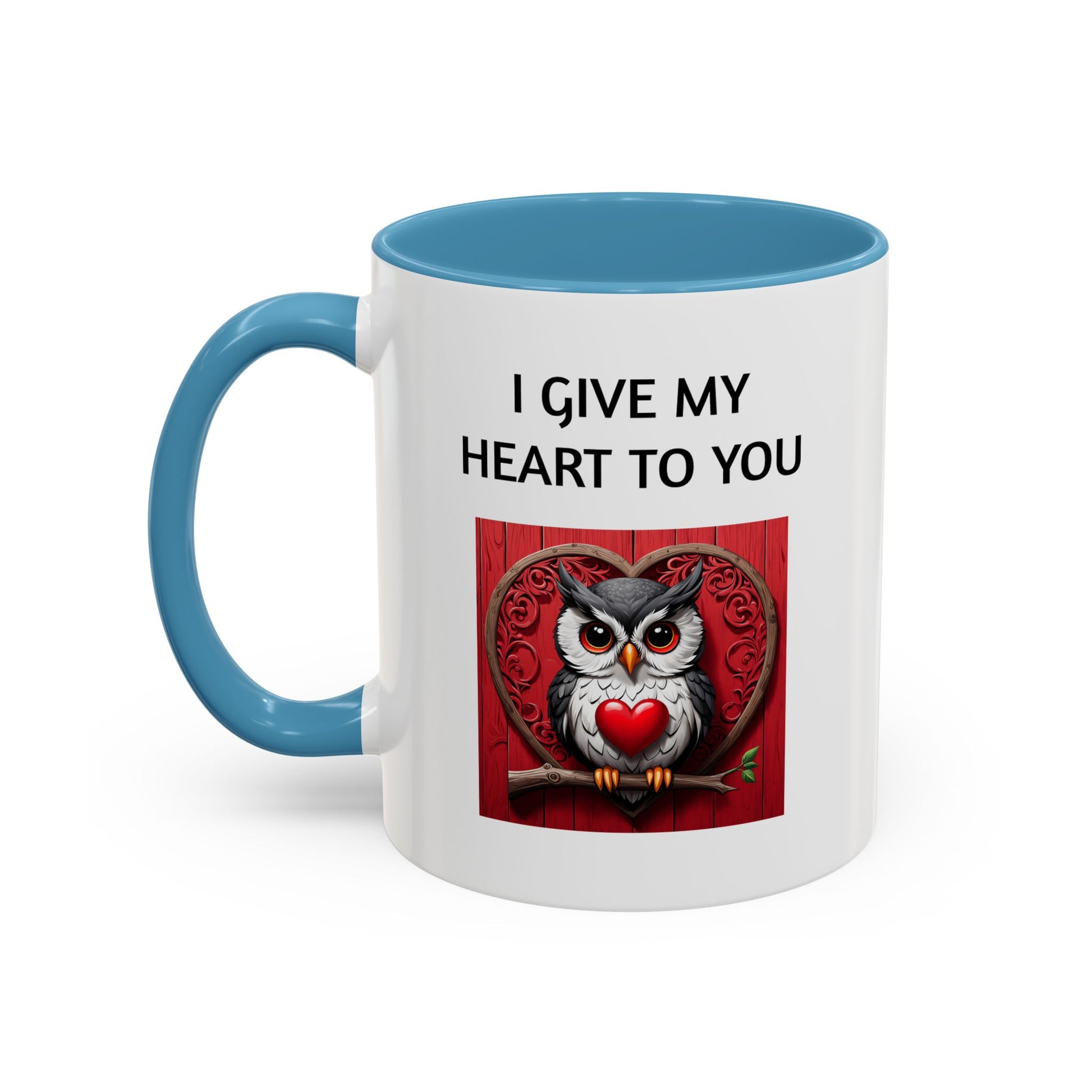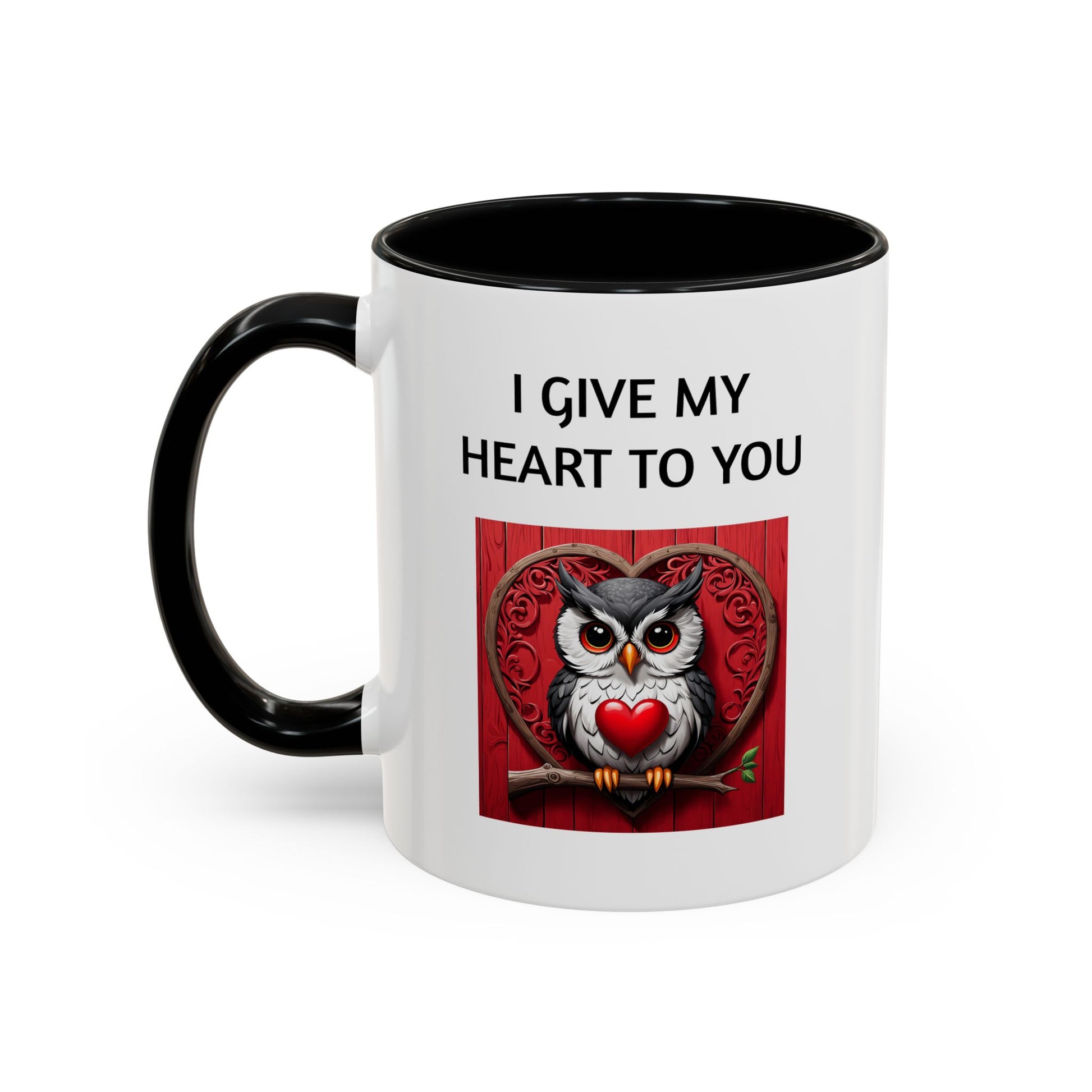 "I give my heart to you". A romantic message for the one you love for any special holiday or occasion. Meet your next favorite morning companion, the accented ceramic mug. This mug brings the perfect blend comfortable grip, while the lead-free and BPA-free construction allow for peace of mind with every sip. Free worldwide shipping.